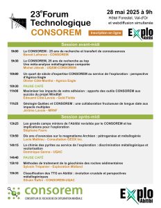 Dans le cadre du forum de cette année, les 25 ans du CONSOREM seront soulignés. La programmation inclut des présentations des fondateurs, des anciens et actuels chercheurs et chercheuses ainsi que de collaborateurs de longue date parmi les membres industriels. Le Forum technologique du CONSOREM est présenté en collaboration avec l’AEMQ dans le cadre d’Explo Abitibi 2025.